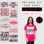 Get ready for Valentine's Day with our Pre-Made Gang Sheet! With 10 DTF designs, each measuring 10-11 inches, you'll be able to easily create custom shirts, bags, and more for your loved ones. Simply press and go - no need for any extra prep work. Show your passion for crafting with our Valentine's Pre-Made Gang Sheet!