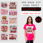 Get ready for Valentine's Day with our Pre-Made Gang Sheet! With 10 DTF designs, each measuring 10-11 inches, you'll be able to easily create custom shirts, bags, and more for your loved ones. Simply press and go - no need for any extra prep work. Show your passion for crafting with our Valentine's Pre-Made Gang Sheet!