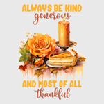 Celebrate food and family with this "Always Be Kind Generous And Most of All Thankful'" transfer. Ideal for creating t-shirts that embrace the joyful togetherness and delicious feasts of the Thanksgiving season.