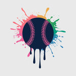 A modern baseball graphic featuring deep navy tones with pink stitching and multicolor paint splashes. The dripping effect adds a trendy street-style edge. Ideal for standout athletic apparel designs.