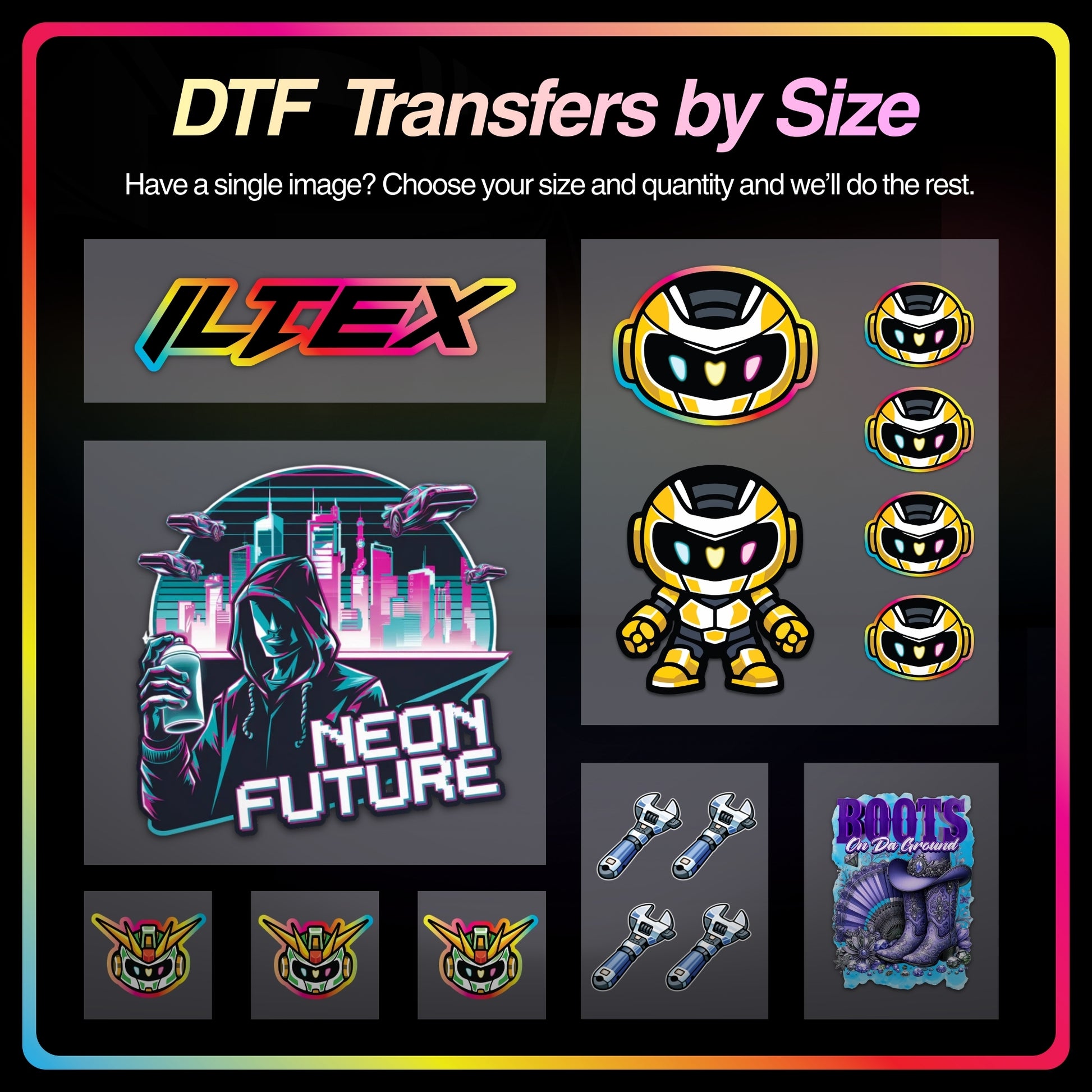 Print Any Design, Any Size, on Any Material: ILTEX DTF (Direct-to-Film) transfers provide vibrant, durable prints for any garment or material—cotton, polyester, blends, or even leather. Available in a variety of sizes, our transfers let you pick the perfect fit for your design, or contact us for a custom size tailored to your needs. Our proprietary adhesive powder and premium inks ensure strong bonding across different fabrics.